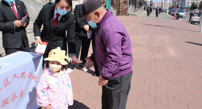 “叔叔、阿姨,您好我是金林区人民法院干警,请您看一下我们的宣传册,这里主要介绍关于防止养老诈骗,反有组织犯罪法的相关法律内容,您看一看,也可以分享给身边的朋友和家人,警惕新型养老诈骗,别让犯罪分子有机可乘,遇到拿不准的情况可以来法院寻求帮助。”