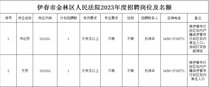 因审判工作需要,伊春市金林区人民法院面向社会公开招聘聘用制书记员1名、文员1名。现将有关事项公告如下: