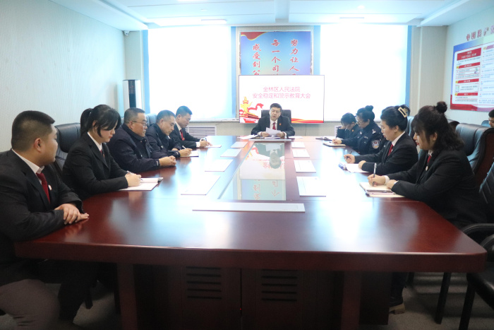 金林区人民法院召开安全稳定和警示教育大会。党组书记、院长刘志峰主持会议并发表讲话,党组成员、各庭室负责人及全体干警参加会议。会议传达了省市第十三届纪委全体会议精神,强调了春节前安全事项及警示教育。