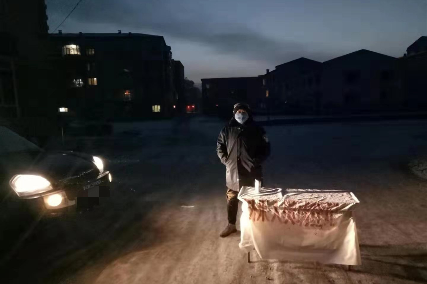 凌晨六点,多数居民还在温暖的家中熟睡,干警已经准时到位,因为凌晨气温过低,不过一刻钟,帽子上、睫毛上、口罩上、衣领上结了厚厚的一层冰霜。