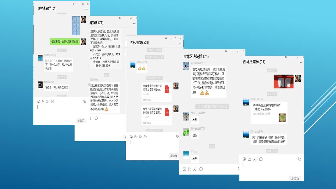 二、强化内防,严格落实防疫工作。西林法庭通过电话、微信群、QQ群等即时通讯软件及时向法庭全体干警转发国家、省、市、区委关于新冠肺炎疫情防控工作的各项通知、公告、相关文件精神以及涉及到的西林法庭各业务部门的业务工作,提高干警对疫情严峻形势的认识,在落实个人及家庭防护的同时,自觉做到不信谣、不传谣。